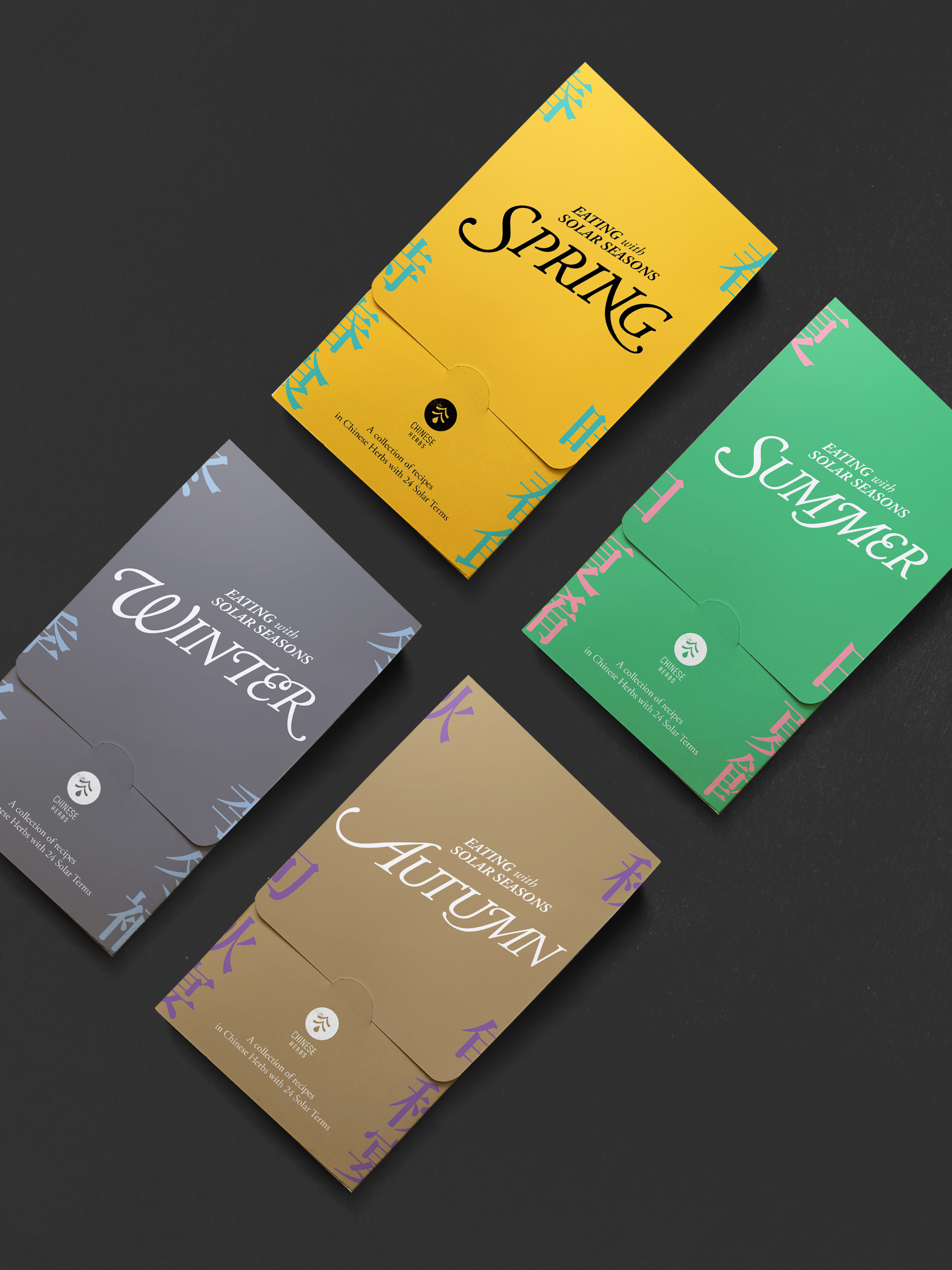 The concept of this project focuses on recipes with Chinese herbs and eating with the seasons. It will be a set of packagings with four cardholders that refer to four seasons, Spring, Summer, Autumn and Winter. In the contents, there will be three recipes and related Chinese herbs included within each season, in addition, the explanation of the 24 solar terms and Chinese proverbs will be introduced.